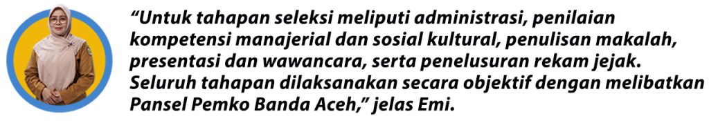 Kepala Badan Kepegawaian dan Pengembangan Sumber Daya Manusia (BKPSDM) Kota Banda Aceh, Dra. Emila Sovayana, M.Si mengatakan, hal ini sebagai bentuk upaya transparansi yang kompetitif dan berbasis merit.