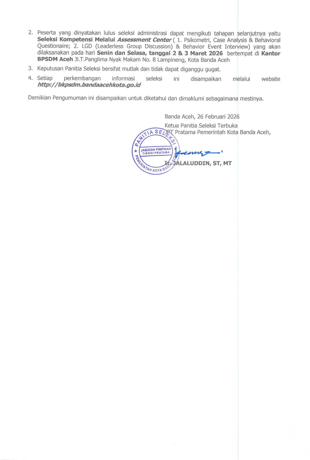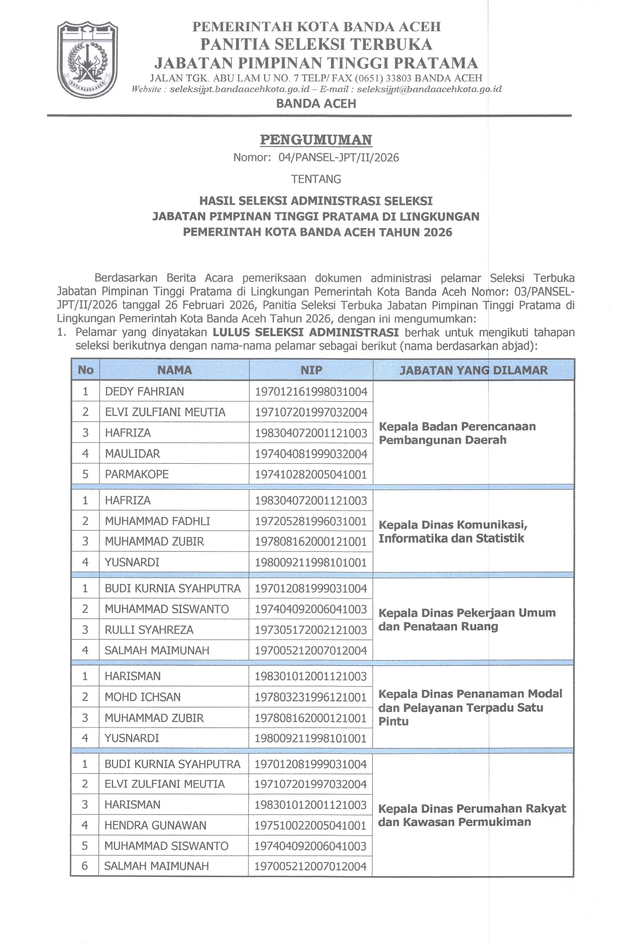 • Pengumuman Hasil Seleksi Administrasi Seleksi JPT Pratama Pemerintah Kota Banda Aceh Tahun 2026 26/02/2026
