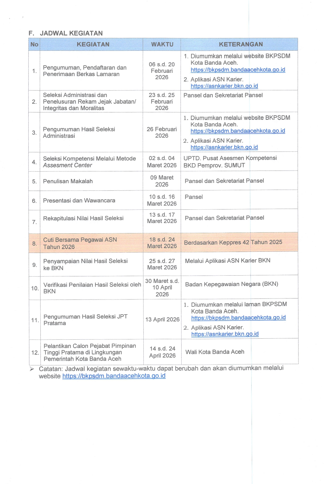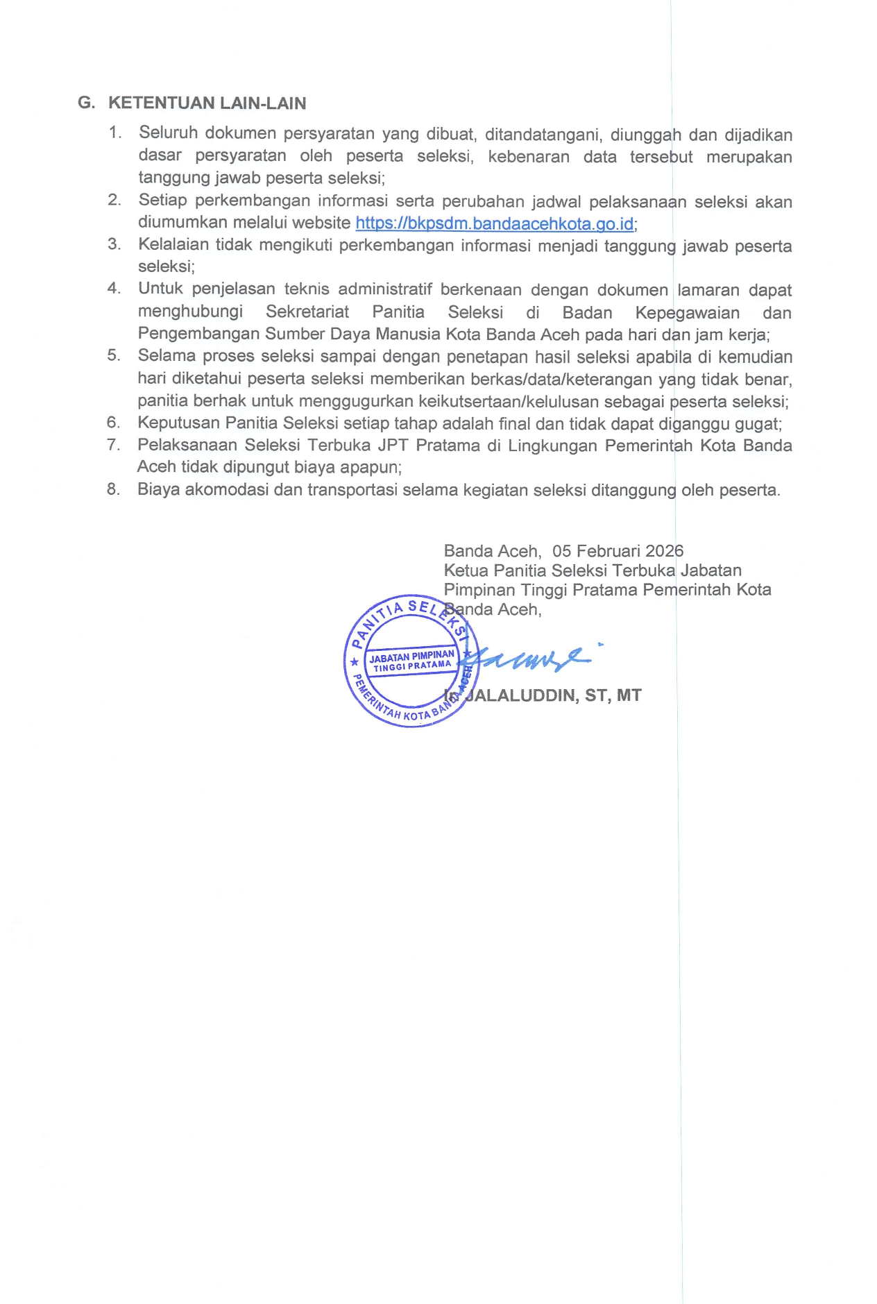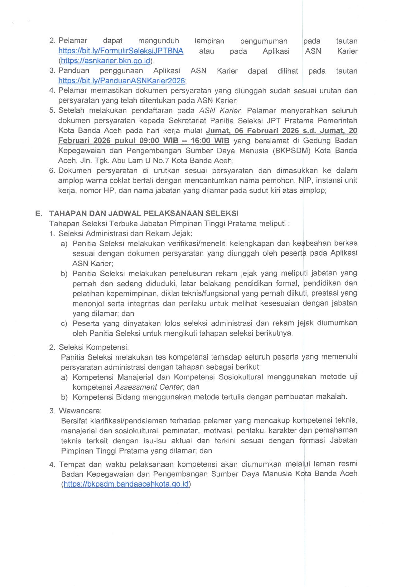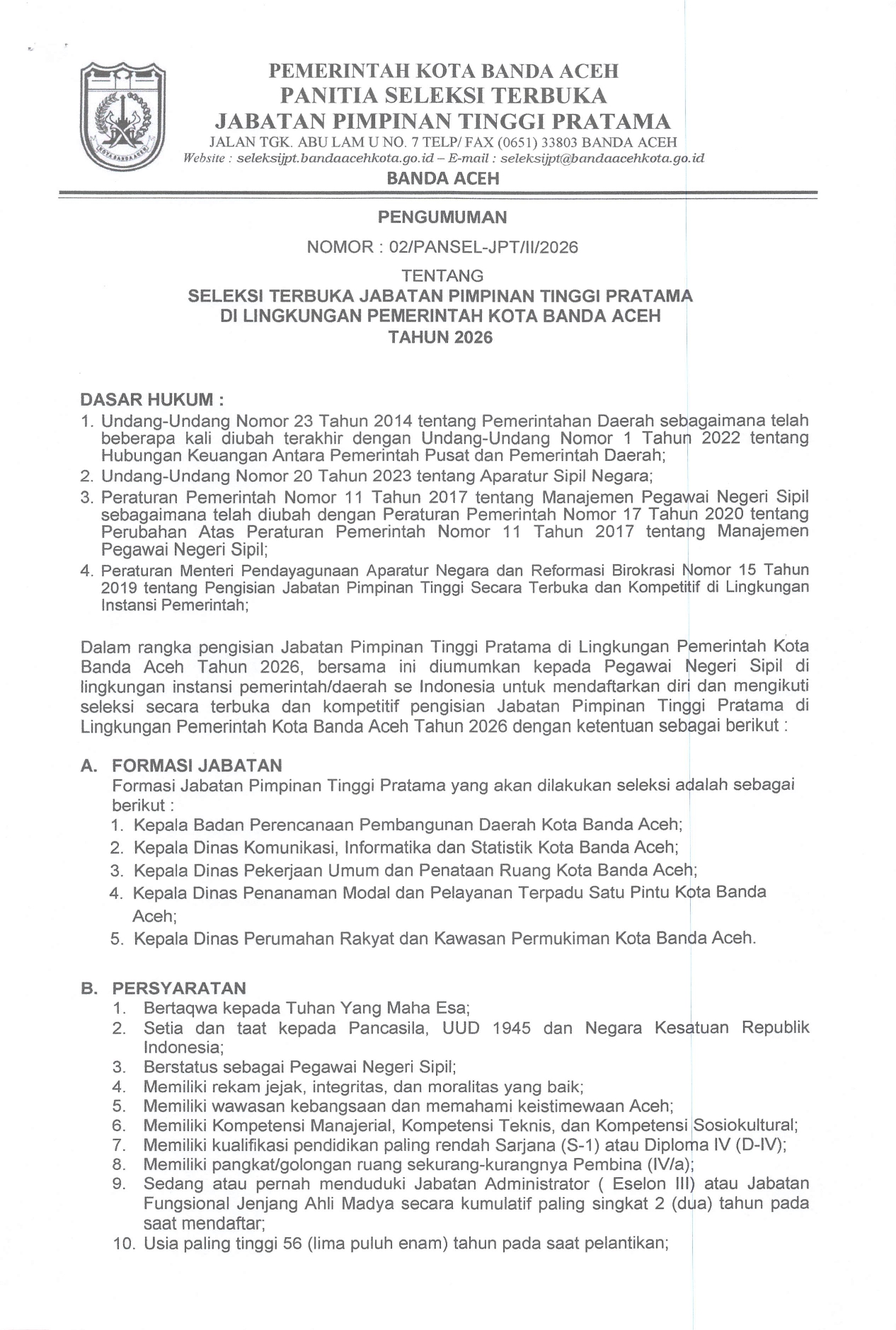 Seleksi Terbuka Jabatan Pimpinan Tinggi Pratama di Lingkungan Pemerintah Kota Banda Aceh Tahun 2026